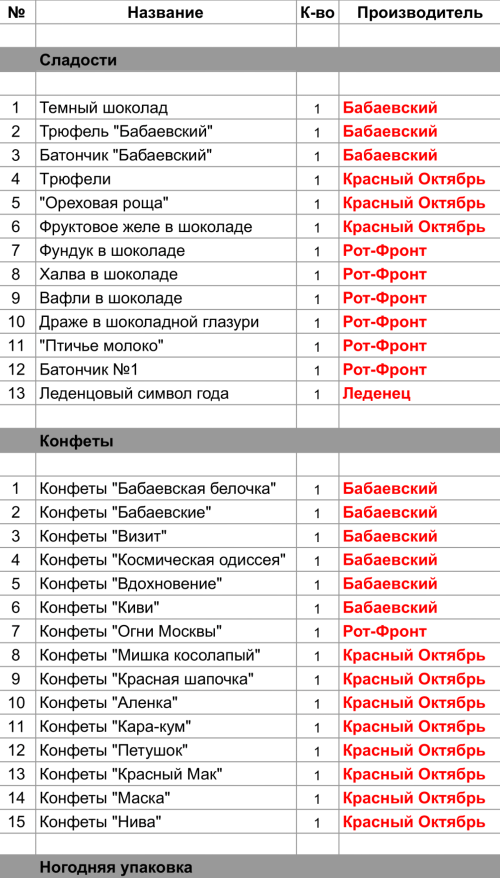 Трюфели (1 шт), "Ореховая роща" (1 шт), Фруктовое желе в шоколаде (1 шт), Конфеты "Мишка косолапый" (1 шт), Конфеты "Красная шапочка" (1 шт), Конфеты "Аленка" (1 шт), Конфеты "Кара-кум" (1 шт), Конфеты "Петушок" (1 шт), Конфеты "Красный Мак" (1 шт), Конфеты "Маска" (1 шт), Конфеты "Нива" (1 шт)
